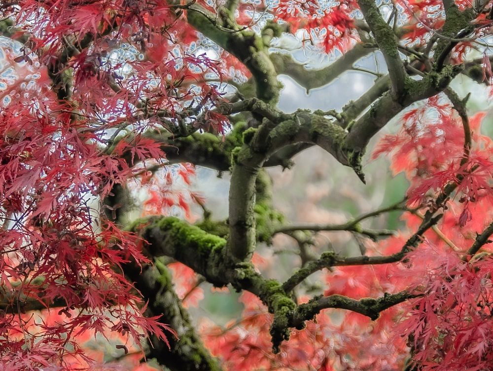 Am schönsten ist der Japanische Ahorn im Herbst, wenn die roten Blätter die moosbewachsenen Äste umgeben.