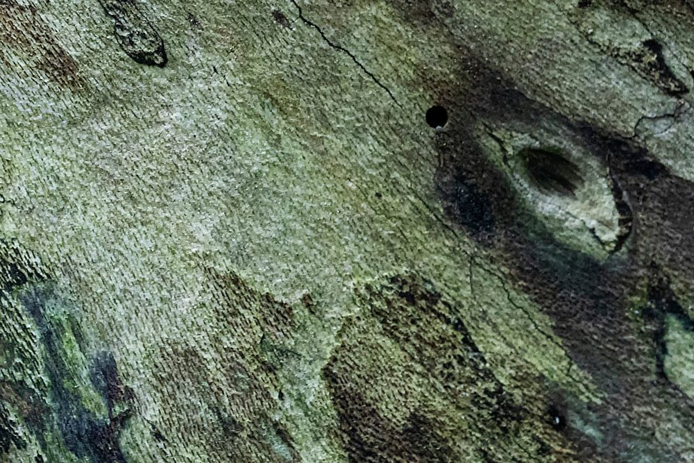 Strukturen auf der Rinde eines Baumes, in denen man mit ein wenig Fantasie alle möglichen Figuren entdecken kann.
