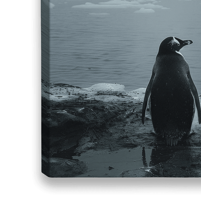Auf diesem Kunstwerk steht ein Pinguin am Rande einer dunklen, nassen Fläche und blickt auf einen ruhigen, aber kalten Ozean hinaus.
