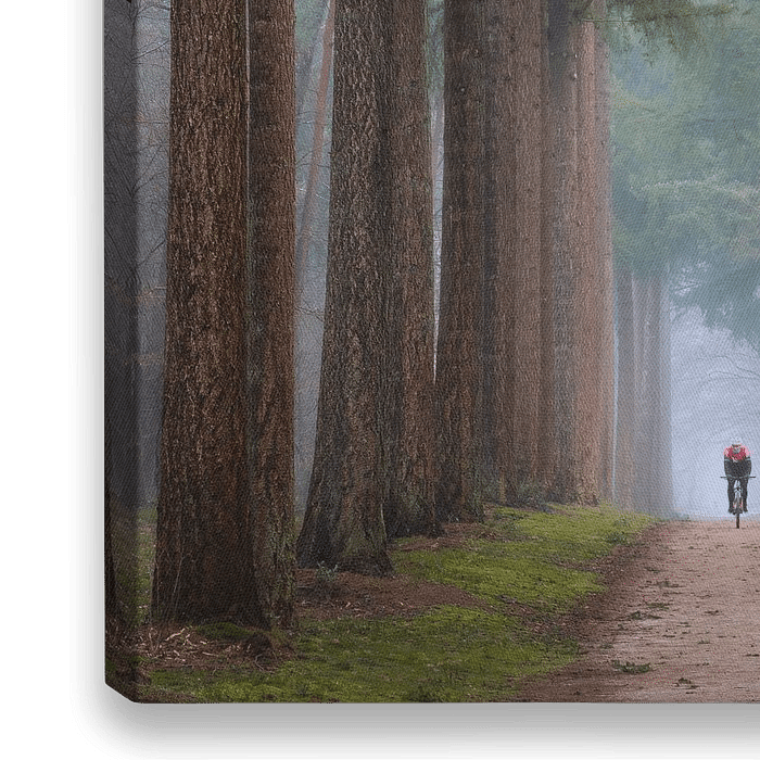 An einem kalten, nebligen Morgen machte dieser Mountainbiker eine Tour durch die Veluwe. Die hohen Bäume entlang dieses Weges geben einen tollen Effekt.