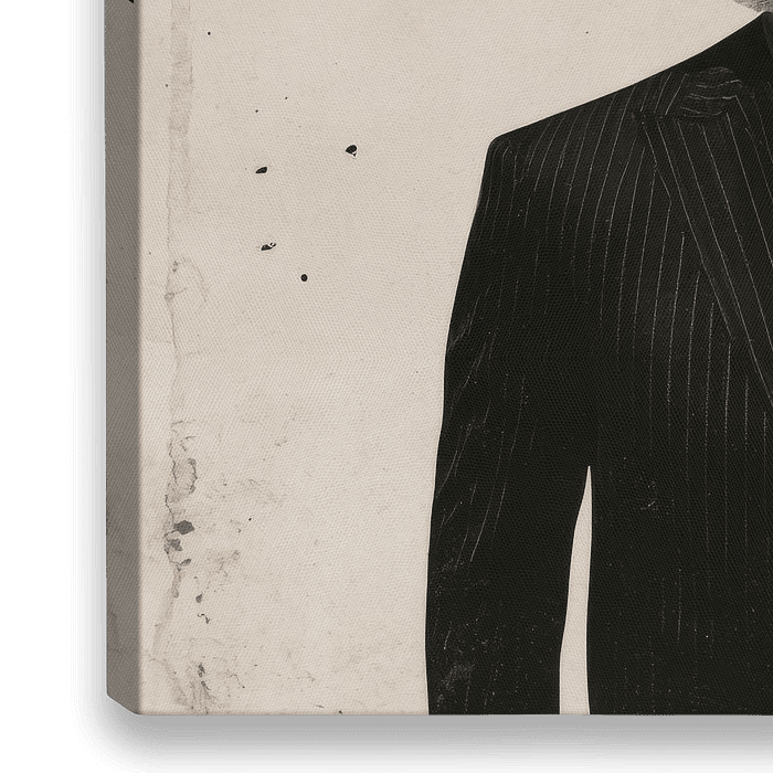 Eine faszinierende Fusion von Mensch und Tier: Ein eleganter Anzug, der in scharfen geometrischen Formen unterbrochen wird, während der majestätische Kopf eines Elefanten das Bild dominiert. Die kräftige orangefarbene Fläche und der makellose schwarze Kreis verleihen dem Ganzen einen Hauch von Surrealismus und verstärken die spannende…