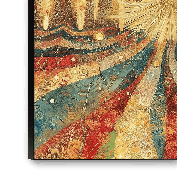 In einer modernen Ode an den griechischen Mythos webt "Golden Veil of Penelope" ein Bild der geduldigen und listigen Königin, eingehüllt in ein strahlendes goldenes Gewand inmitten eines verzauberten Waldes. Die reichhaltigen Texturen und tiefen Farben schaffen eine Szene, die direkt aus einer Legende zu stammen scheint, während die kreisförmigen Motive an das sich ewig drehende Spinnrad erinnern. Dieses Kunstwerk bringt einen Hauch von klassischer Eleganz und zeitloser Schönheit in Ihr Zuhause und zelebriert Einfallsreichtum und weibliche Stärke - Eigenschaften, die Penelope verkörpert.