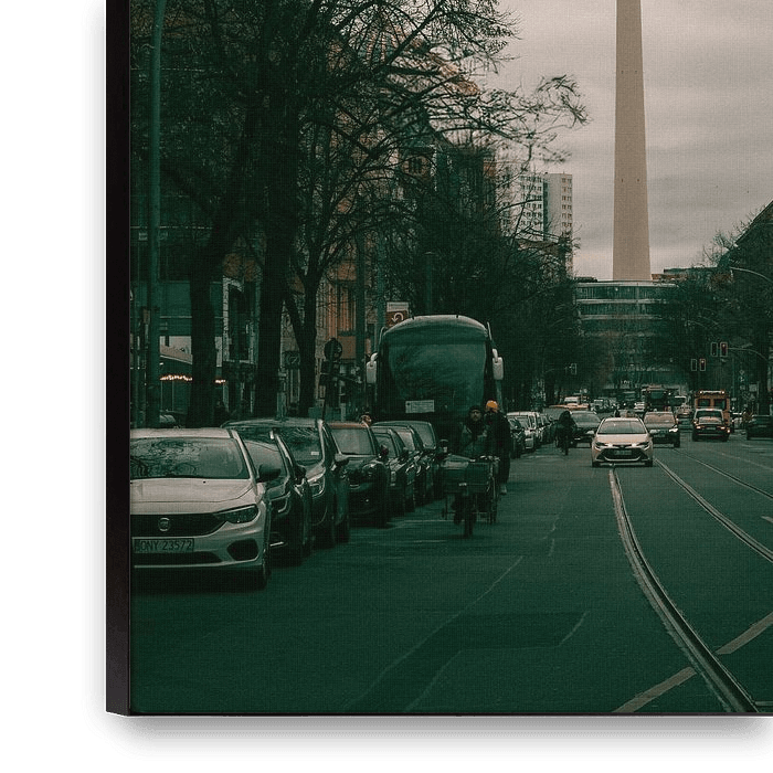 Der ikonische Fernsehturm Berlin ragt kraftvoll über die Skyline der Stadt hinaus, gefangen unter einem schweren, bewölkten Himmel. Der Turm bildet den unverkennbaren Mittelpunkt der Komposition und ist perfekt auf die Straße ausgerichtet, die als visueller Leitfaden zum Horizont führt. Straßenbahnschienen durchschneiden den Asphalt und…