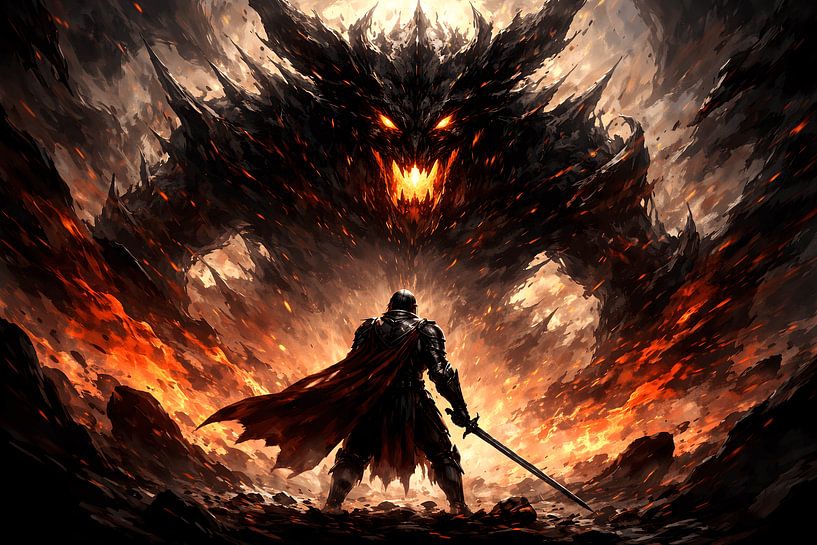 Ein Ritter stellt sich einer hoch aufragenden höllischen Kreatur entgegen, deren zerklüfteter Körper in Flammen und Schatten auflöst. Die leuchtenden Augen und der glühende Kern des Monsters stehen in krassem Kontrast zur dunklen Rüstung der Gestalt darunter und lassen eine Kollision zwischen innerer und äußerer Welt entstehen. Anders…