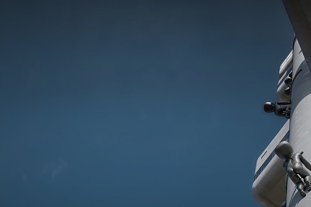 Der moderne Fernsehturm Im Stadtteil Žižkov in Prag mit Ansicht von unten. Bereits von weitem sichtbar ist er ein unverkennbares Wahrzeichen der Stadt Prag. Aus unmittelbarer Nähe ist seine moderne Architektur ein Muss für jeden Fotografen, der die Stadt besucht. Aus jeder beliebigen Perspektive bieten sich ständig neue Gestaltungsmöglichkeiten der Fotografie.
