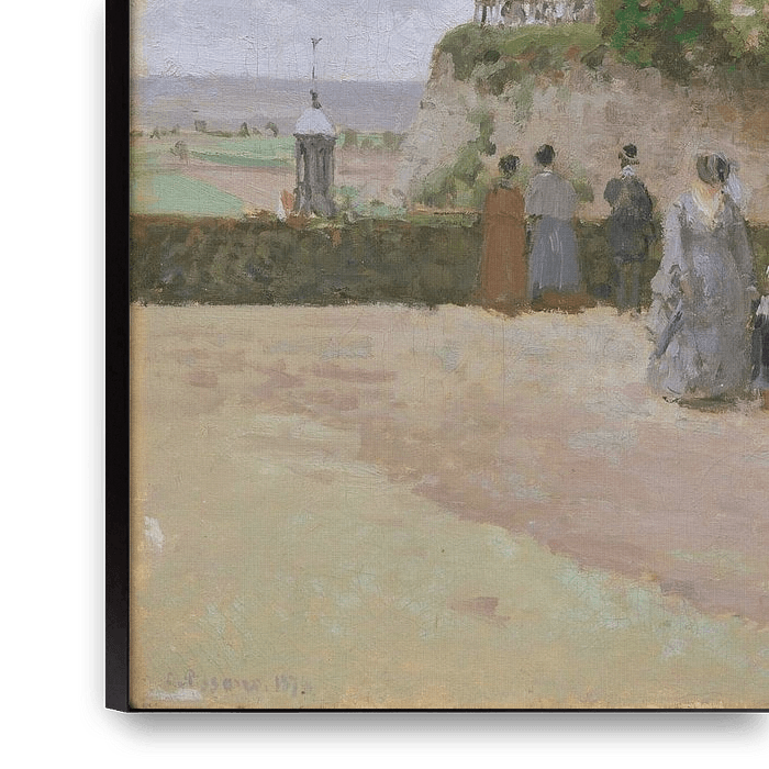 Pissarros Gemälde der Mitte der 1870er Jahre werden in die Felder und Straßen in der Nähe seines Hauses in Pontoise weitgehend gewidmet. Hier wandte er sich an einem städtischen Thema, von der Art, die von Kollegen begünstigt wie Monet und Renoir: Der öffentliche Garten der Stadt. Der Blick über die Montmorency Ebene in Richtung Paris kann, über die Turmspitze von Pontoise der Kirche Notre-Dame links flüchtig gesehen werden. Aber anstatt den Vista betont, konzentrierte sich Pissarro auf den Terrassen des Park, bevölkert von gut gekleideten Bürger und ihre Kinder.