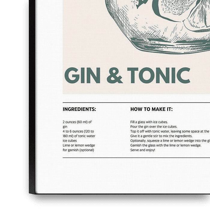 Verleihen Sie Ihrem Zuhause oder Ihrer Bar mit diesem stilvollen Gin & Tonic Kunstdruck einen Hauch von Eleganz. Perfekt für Liebhaber klassischer Cocktails, fängt diese detaillierte Illustration die Essenz des zeitlosen Getränks ein und macht sie zu einem idealen Geschenk oder dekorativen Highlight.