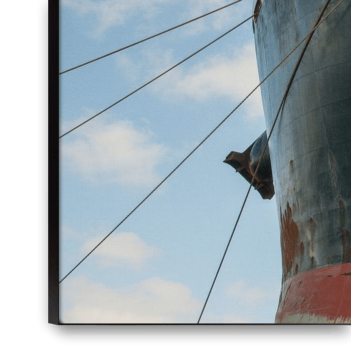 Die Wasserlinie, die Festmacherleinen zum Ufer. Die riesigen Anker, die aus den Gewölbelöchern herausragen. Die Rostspuren und die Reling. Das Schiff hat schon viel erlebt. Die Wolken am blauen Himmel - es ist ein beeindruckender Anblick, wenn man direkt unter einem solchen Bug vorbeifährt. Der…