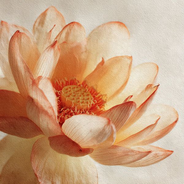Eine warmtonige Nahaufnahme einer Blume mit weichen, geschwungenen Blütenblättern in Pfirsich-, Orange- und Cremetönen, die mit einem leuchtenden Schein vor einem blassen Hintergrund aufgenommen wurde.