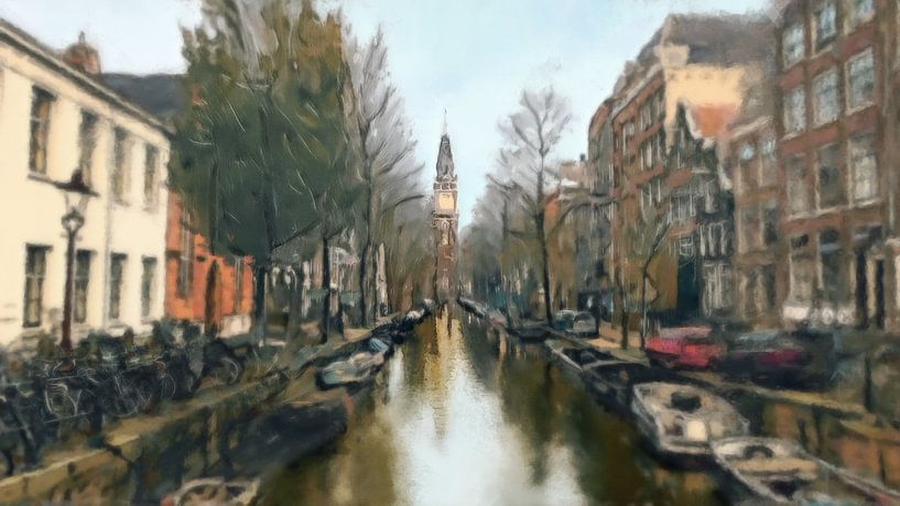 Dieses Werk basiert auf einem Foto, das ich in Amsterdam aufgenommen habe. Es war fast Winter und ich erinnere mich, dass es fast regnen würde, so kalt war es. Der Kanal liegt ruhig da, die Boote befinden sich halb im Winterschlaf, die vielen Fahrräder warten auf ihre Besitzer und ganz in der Mitte steht der Westertoren.