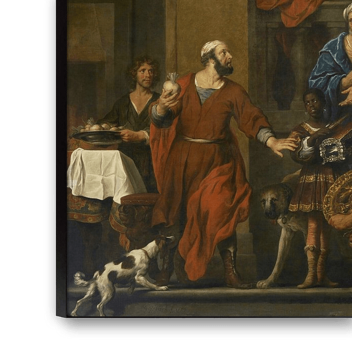 Der Mann in der roten Wolltunika auf der linken Seite des Bildes ist Marcus Curius Dentatus. In der einen Hand hält er eine Rübe, mit der anderen winkt er das Gold und andere Geschenke ab, die ihm der Mann mit dem weißen Gewand und dem roten Mantel, ein Anführer der Samniten, anbietet. Er versucht, den römischen Konsul zu bestechen, aber Marcus Curius' schlichte Kleidung und die Rübe zeigen, dass er mit seinem einfachen Leben zufrieden ist und kein Verlangen nach den angebotenen luxuriösen Geschenken hat.