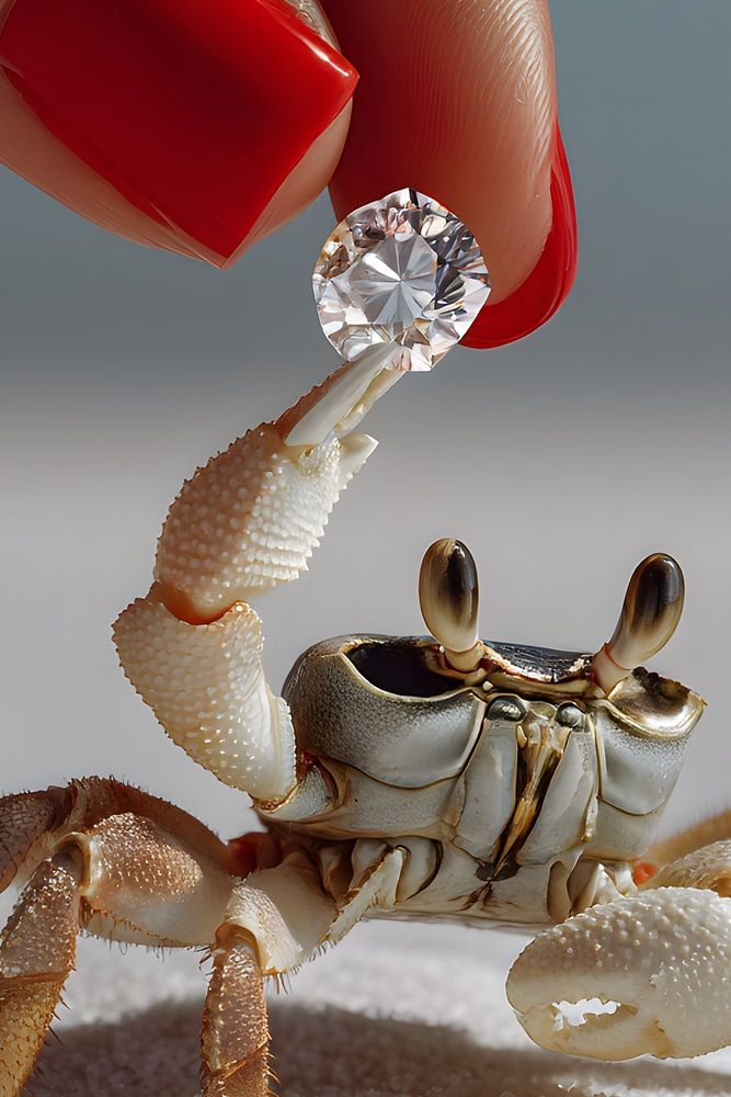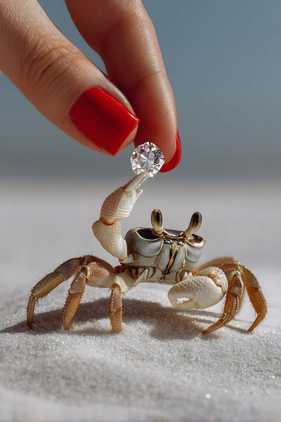 Das Bild zeigt eine kleine Strandkrabbe auf feinem, hellem Sand. Eine Hand mit leuchtend roten, gepflegten Fingernägeln nimmt von der Krabbe einen funkelnden Diamanten, den die Krabbe in ihrer Schere hält. Der Hintergrund ist weich verschwommen und vermittelt eine klare, sonnige Strandatmosphäre.