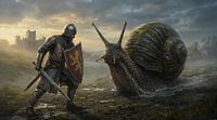 Dieses Werk spielt mit Erwartungen. Ein Ritter, gerüstet und kampfbereit, steht einem Gegner gegenüber, der alle klassischen Regeln des Heldentums untergräbt: einer riesigen Schnecke. Kein feuerspeiendes Monster, kein Dämon mit Klauen – sondern etwas Langsames, Glänzendes und unverkennbar Präsenzvolles. Gerade deshalb ist die…