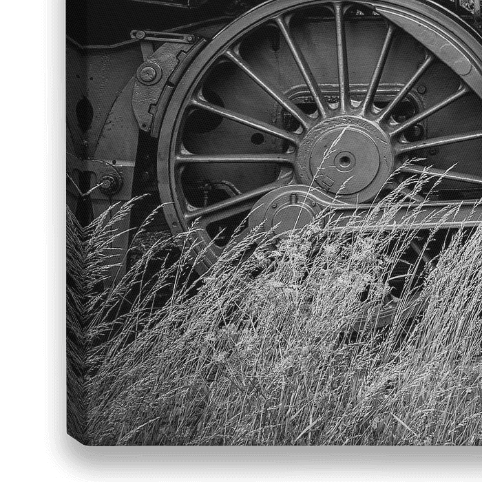 Dampflokräder in Nahaufnahme hinter dem Gras, das entlang der Bahnstrecke wächst. Schwarz-Weiß-Foto.