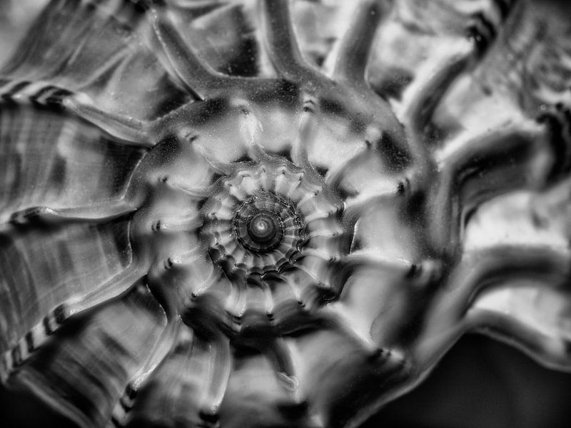 Detail einer Meeresschnecke in Schwarz-Weiß mit ihrem runden Schneckengängen