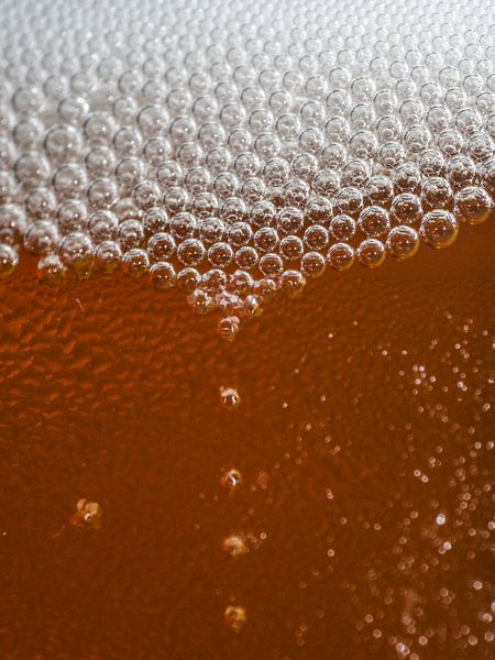 Auf diesem Foto steigen Kohlendioxidblasen blitzschnell an die Oberfläche. Beim Fotografieren mit einem Makroobjektiv kommen die Details besonders gut zur Geltung. Sehen Sie, wie die Blasen in einem Muster nebeneinander liegen. Zusammen bilden die Blasen die Schaumkrone, und diese trägt dazu bei, dass das Bier seinen Geschmack länger…