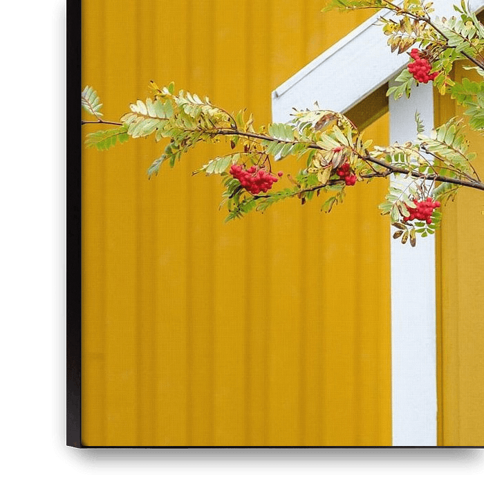 Über „Detail eines gelben norwegischen Hauses, Baum mit roten Beeren in Norwegen“ von Melissa Peltenburg