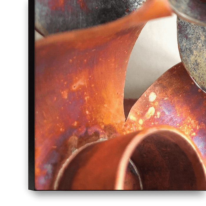 Een detail van twee koperen bloemen met roze, paarse en blauwe patina. Beide bloemen zijn handgemaakt door Smidden.