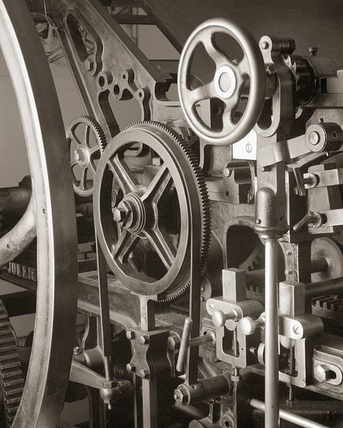 Bestelle das Foto Detailansicht einer Buchdruckpresse von Jan van der Schalie Analoge Fotografie als Reproduktion auf Leinwand, Alu-Dibond, als Poster, Fototapete oder Acrylglasbild.