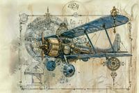 Detaillierte Zeichnung eines alten Doppeldeckers. Der Hintergrund enthält technische Zeichnungen und Skizzen, die das Design des Flugzeugs mit seinen komplexen Zahnrädern, Uhren und anderen mechanischen Teilen ergänzen. Die in diesem Kunstwerk verwendeten Farben sind vor allem Blau,…
