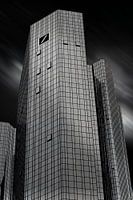 Schwarz-Weiß-Aufnahme des modernen Gebäudes der Deutschen Bank in Frankfurt am Main.