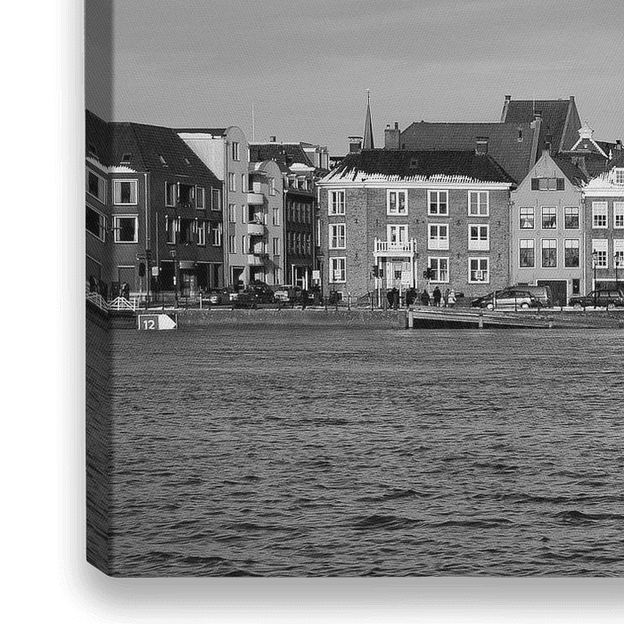 Schwarzweißfoto der Skyline von Deventer mit dem Fluss IJssel im Vordergrund.