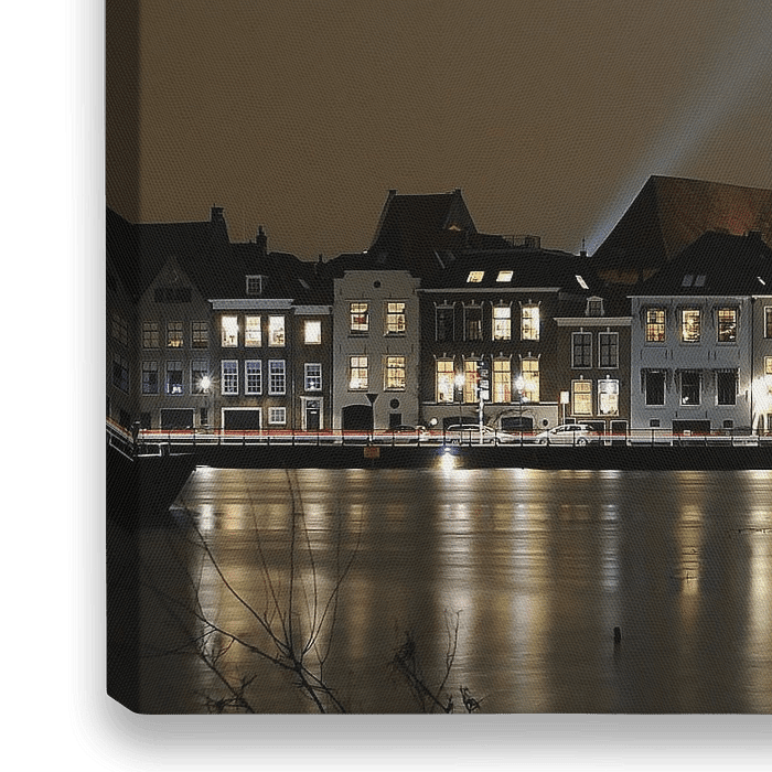 Stadtfoto von Deventer bei Flut. Hergestellt von De Worp. Auf dem Foto ist ein Teil der Wellekade und der Lebuïnus Kirche zu sehen. Dieses Foto ist auch in schwarzweiß erhältlich.