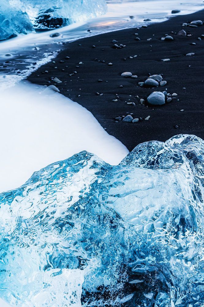 Diese Eisblöcke sind wie Diamanten, daher auch der richtige Name: Diamond Beach. Der Kontrast zwischen den weißen Schaumköpfen und dem schwarzen Sand hat mir sehr gut gefallen. Hoffentlich tun Sie das auch? ;-)