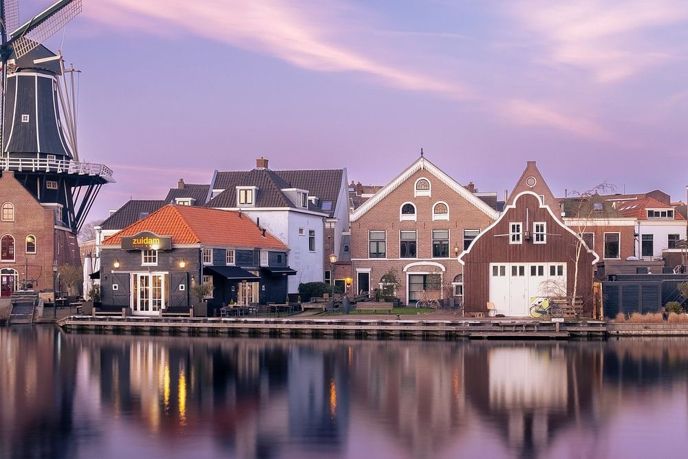 Die historische Windmühle De Adriaan in Haarlem, wunderschön beleuchtet von den warmen Farben des Sonnenuntergangs. Die ruhige Spiegelung im Wasser macht dieses Bild zu einem zeitlosen und stimmungsvollen Stadtbild.