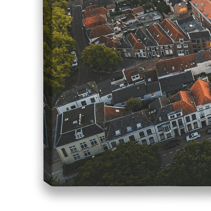 Kampen, die alte Hansestadt am Ufer der IJssel in Overijssel, von oben gesehen während eines sommerlichen Sonnenuntergangs.