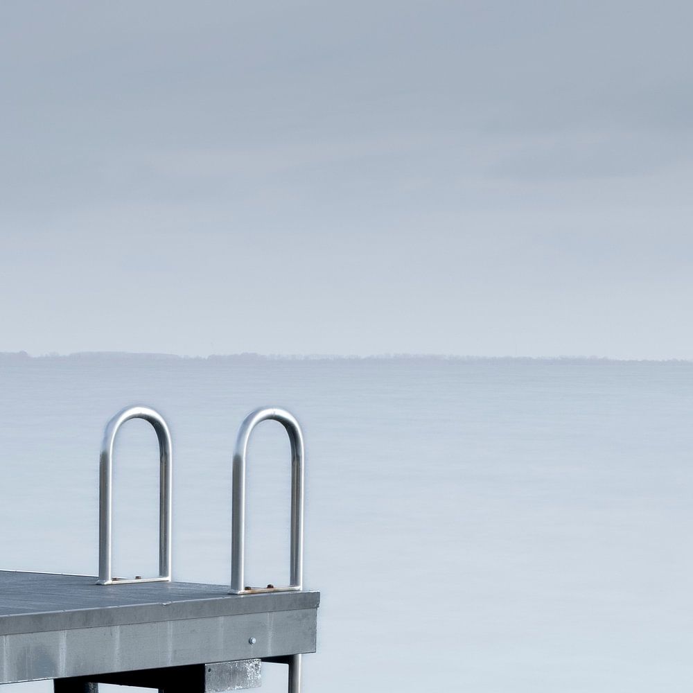 In der unteren linken Ecke der Skulptur befindet sich ein Gerüst, einfach und geradlinig. Es besteht aus einer Reihe von Holzbrettern, aber das Ganze hat etwas Beruhigendes und Zeitloses an sich. Der Steg scheint fast in der Skulptur zu schweben, wie eine Pfeilspitze, die zum Weiterschauen, zum Weiterdenken einlädt. Eine Treppe führt zum Wasser, das in seiner absoluten Ruhe fast nicht vom Himmel zu unterscheiden ist. Aufgrund der langen Belichtungszeit ist das Wasser flach, vollkommen glatt, ohne Falten. Die monochrome Farbgebung unterstreicht die ruhige und minimalistische Schönheit der Komposition. Alles auf dem Bild atmet Stille, eine Gelassenheit, die durch die Einfachheit des Rahmens noch verstärkt wird. Es gibt keine Ablenkungen, keine Farben, die Ihre Aufmerksamkeit erregen - nur die Formen, die Linien und die Ruhe der Natur, die sich vor Ihnen ausbreitet. Dieses Bild erweckt ein Gefühl der Stille, wie ein Moment der Selbstbeobachtung. Hier gibt es keine Bewegung, nur die Idee, still zu stehen und die Ruhe der Landschaft zu genießen.