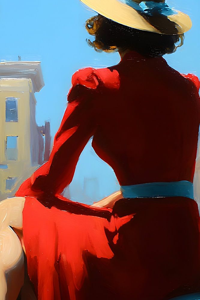 Eine Frau in einem leuchtend roten Kleid sitzt auf einer gepolsterten Fensterbank. Sie trägt einen hellen Sommerhut mit blauem Band. Ihr Rücken ist dem Betrachter zugewandt, der Blick geht hinaus auf eine helle, fast menschenleere Straße mit schlichten Stadthäusern unter klarem Himmel. Das Sonnenlicht modelliert ihre Silhouette scharf…