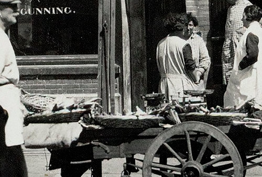 Stand (Hering) vor einem Café am Waterlooplein in Amsterdam mit Menschen auf der Straße. 1920s.
