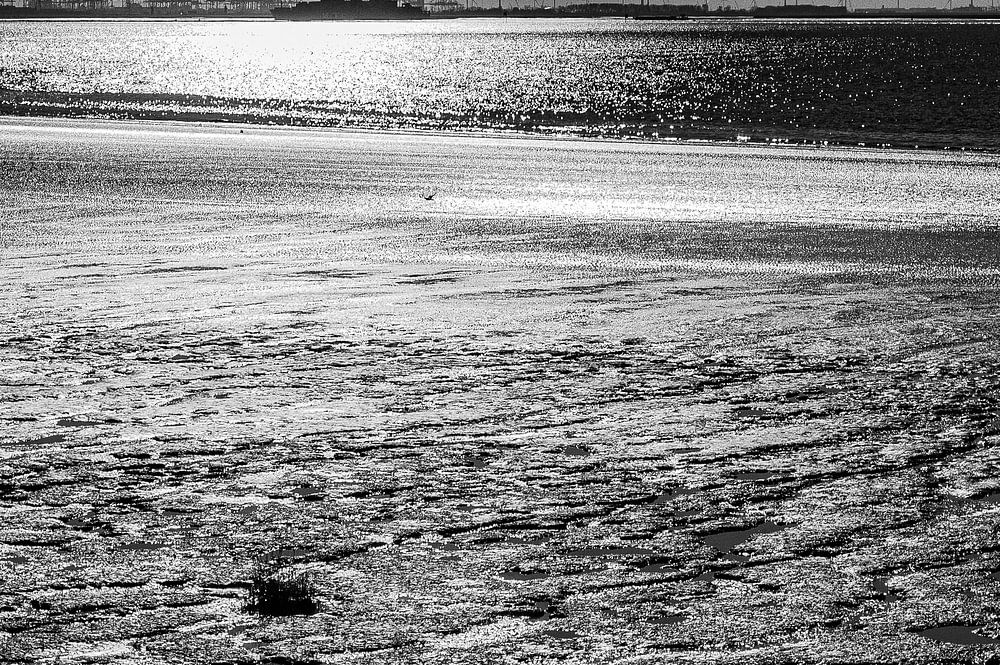Im klaren, silbernen Licht zeigt sich die Bucht von Bath an der Westerschelde als ein beeindruckendes Stück seeländischer Gezeitenlandschaft, in der Natur und Industrie aufeinandertreffen. Über den weiten Wattflächen und Salzwiesen glitzert das Wasser bei Ebbe und erzeugt die charakteristischen Muster, für die dieses Gebiet bekannt ist. Am Horizont dominieren die Kühltürme, Windmühlen und Kräne des Antwerpener Hafens, ein auffälliger Kontrast zur Ruhe und Offenheit der umliegenden zeeländischen Natur.