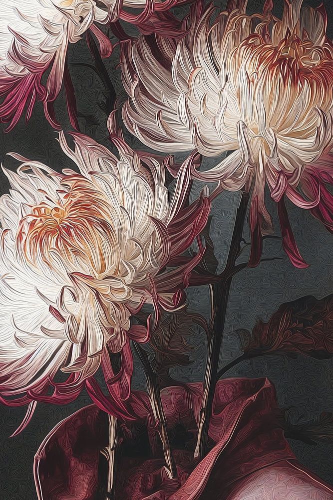 Ein surreales Kunstwerk mit einer kopflosen rosa Jacke, deren Kopf durch drei üppige weiße Chrysanthemen mit rosa Farbtönen ersetzt wurde. Das Bild ist vor einem dunklen Hintergrund platziert, der seine dramatische Präsenz verstärkt und mit den Grenzen zwischen menschlicher Identität und natürlicher Schönheit spielt.