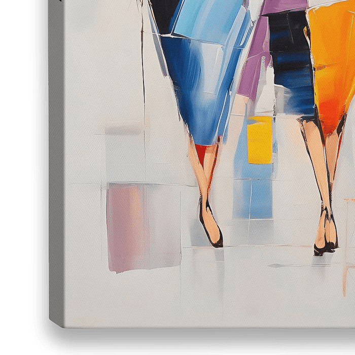 Ein modernes abstraktes Kunstwerk von vier Frauen, die in farbenfrohen Outfits spazieren gehen. Ihre Bewegungen strahlen Selbstvertrauen und Eleganz aus. Geometrische Formen und leuchtende Farben mit einem starken Einsatz von Palettentechnik.