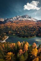 Herbstfarben in den Dolomiten. Das Bild wurde mit einer Drohne aufgenommen. Auf dem Foto "Lago Antorno"