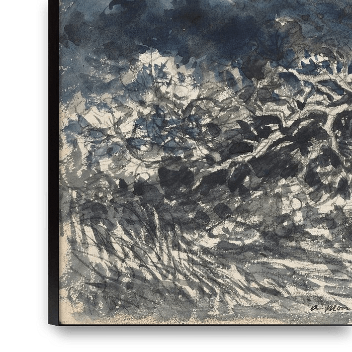 Der Eichenbaum und das Schilfrohr illustriert die gleichnamige Fabel des französischen Schriftstellers Jean de La Fontaine (1621-1695) aus dem 17. Jahrhundert. Nachdem sie das Schilfrohr verächtlich bemitleidet hat, weil es sich vor dem Wind biegt, wird die Eiche von einem grandiosen Nordwind von der Erde gerissen. Daubigny konzentrierte sich auf die entwurzelte Eiche und schuf eine heftig expressive Behandlung des Themas. Das kühne Fleckchen von Licht und Dunkelheit unten wird durch das intensive Blau der Wolken, die von links auf das Land eindringen, hervorgehoben. Die diagonalen Streifen der darüber liegenden, dünn aufgetragenen grauen Wäsche lassen auf Schlagregen schließen.