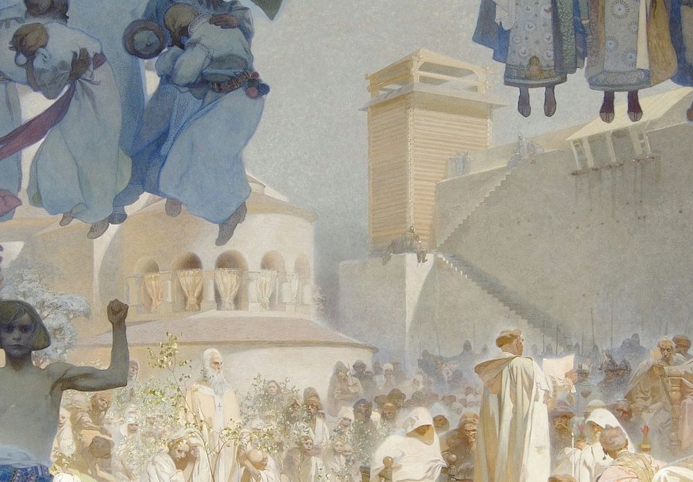 Die Einführung in die slawische Liturgie: Lobe den Herrn in deiner Muttersprache, Alphonse Mucha (1912) Das slawische Epos: Cicle III