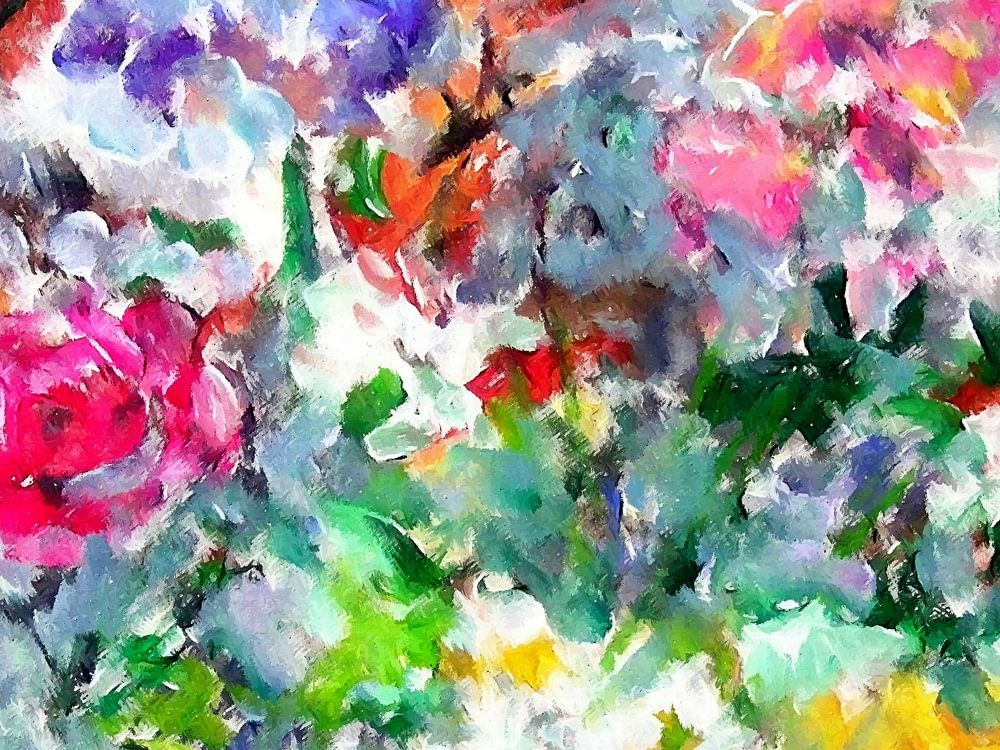 Bunte Blumen im Frühling. Gemalt mit Ausdruck, aber auch in der Art des Impressionismus. Das Original ist ein Gemälde auf Leinwand. Das Foto wurde digital ein wenig manipuliert.