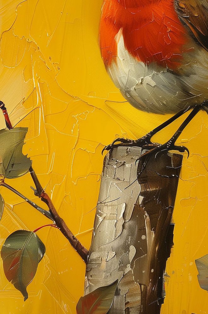 Ein Rotkehlchen sitzt auf einem Ast vor einem weichen, gelben Hintergrund, der Wärme und Licht ausstrahlt. Die Kombination aus der hellen Brust und dem sonnigen Schein macht dieses Werk fröhlich und einladend. Dieses Werk ist Teil der Serie Farben des Rotkehlchens, in der der Vogel in verschiedenen Stimmungen dargestellt wird.