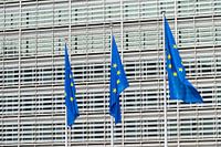 Ein echtes Symbolbild aus dem Europaviertel in Brüssel: die drei Flaggen Europas mit dem Berlaymont-Gebäude im Hintergrund - ideal, wenn Sie die Nachrichten selbst zu Hause präsentieren wollen!