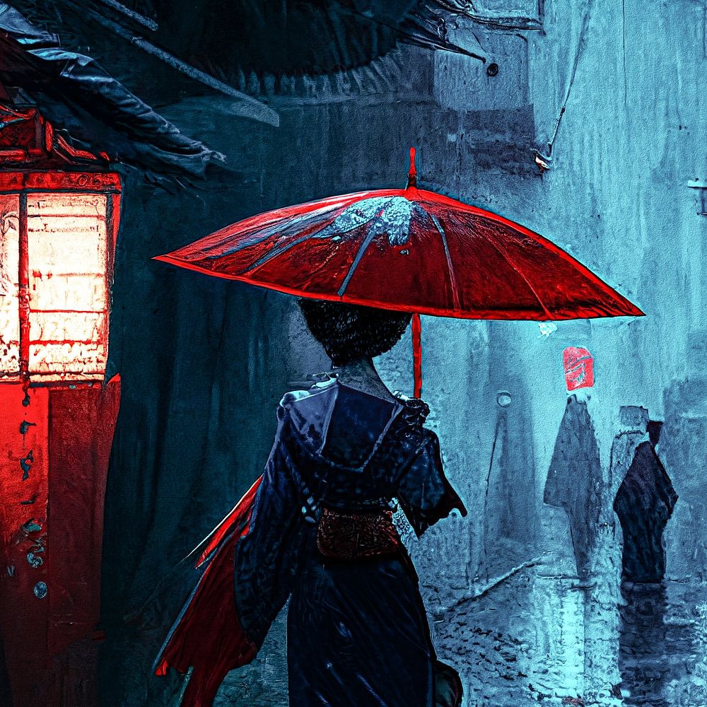 Als sie an den Eingängen eines Restaurants vorbeikam, bemerkte sie, dass dessen Lampen in leuchtendem Rot erstrahlten, welches sich in ihrem vom Regen nassen Regenschirm spiegelte und dadurch der Szene eine besondere Atmosphäre verlieh. Die Gebäude links und rechts der Gasse erschienen ihr aufgrund des schlechten Wetters dunkelblau, was dem leuchtenden Rot des Regenschirms einen schönen Kontrast verlieh. Sie lächelte, denn das Rot war eine Farbe, die ihr Glück bringen sollte.