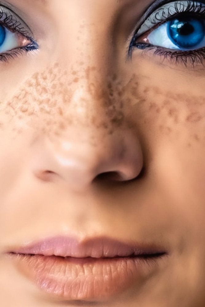 Porträt einer jungen Frau im Schleier mit sehr hellen blauen Augen und Sommersprossen