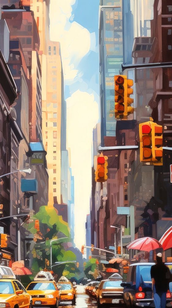 Das nasse Pflaster reflektiert die hohen Gebäude und die Grautöne der Stadt mit leuchtenden Farben hier und da: das Rot der Regenschirme, das Gelb der ikonischen Taxis, das Grün der Bäume und die verschiedenen Farbtöne der städtischen Architektur. Der Himmel ist immer noch von der Helligkeit eines kürzlich aufgeklärten Himmels erfüllt, und die Wolkenkratzer ragen stolz in die Höhe und zeigen die vertrauten Umrisse der historischen Gebäude, die die New Yorker Skyline bestimmen.