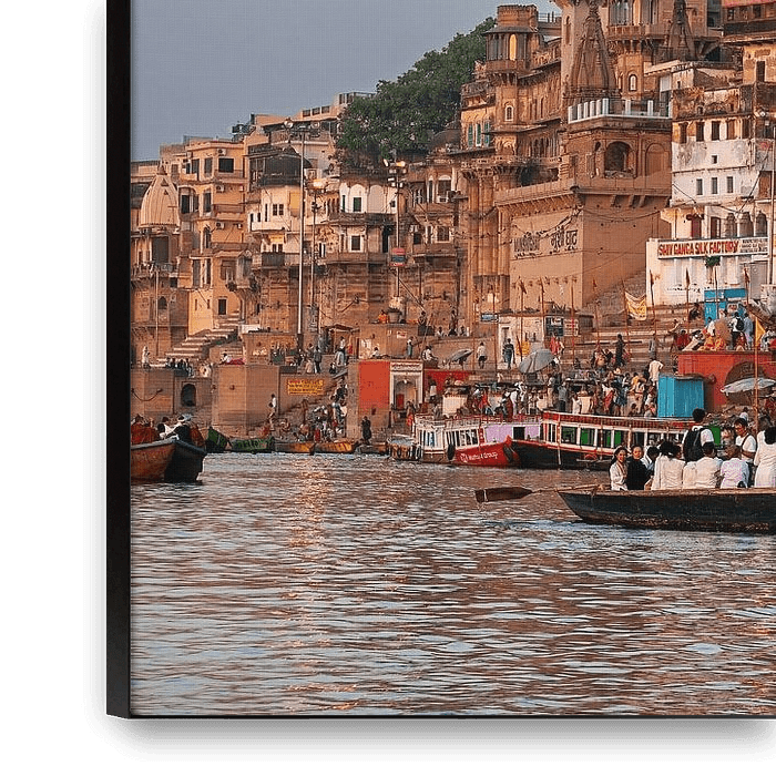 Bestelle das Foto Die Ghats von Varanasi am Ganges von Roland Brack als Reproduktion auf Leinwand, Alu-Dibond, als Poster, Fototapete oder Acrylglasbild.