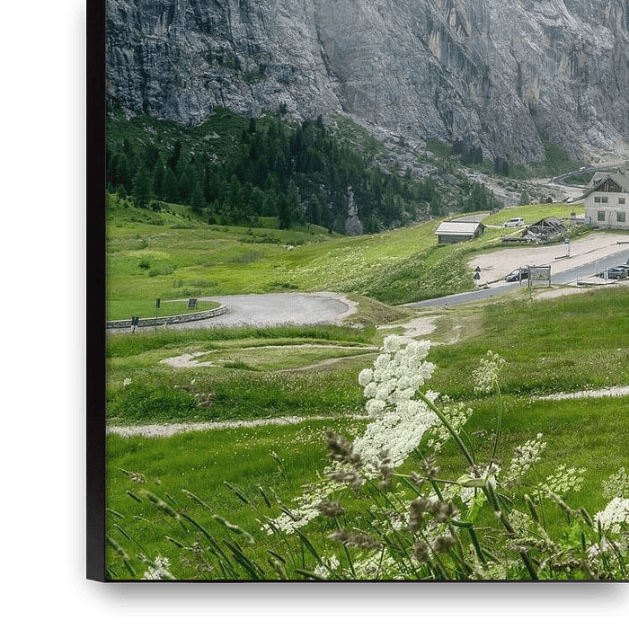 Die Komposition zeigt die dramatischen, zerklüfteten Kalksteingipfel der Sellagruppe, die sich über den mit Wildblumen gefüllten Almwiesen erheben.