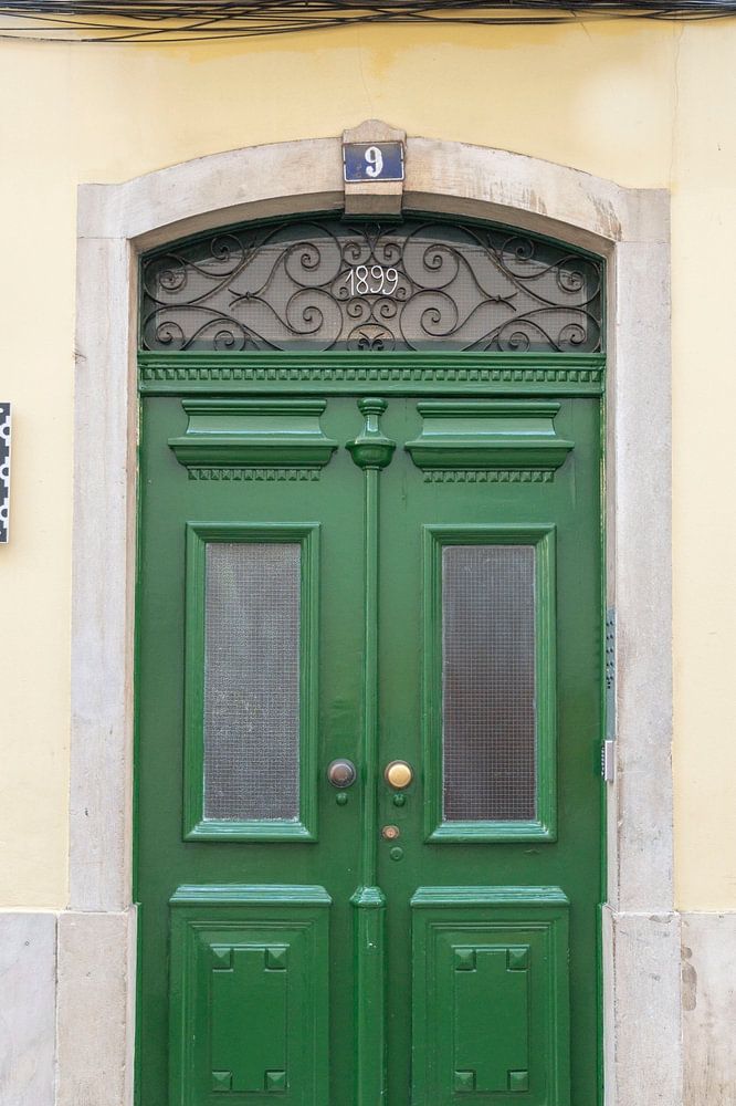 Tür, Haustür, Portugal, Reise, Reisefotografie, Straße, Straßenfotografie, mediterran, gelb, grün, pastell, vintage, Sommer, Haus, Eingang, alt, Altstadt, Architektur, wabi sabi,