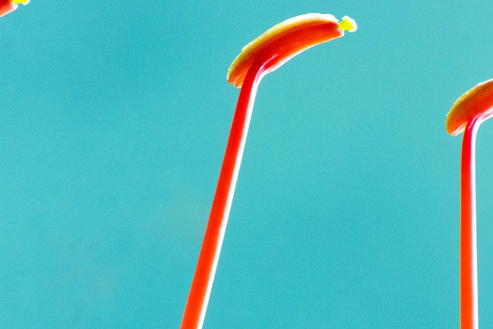 Drei Blütenstempel tauchen aus dem Nichts auf, schlank und leuchtend, wie in die Luft gezeichnete Tintenstriche.