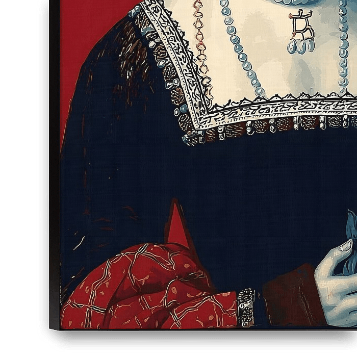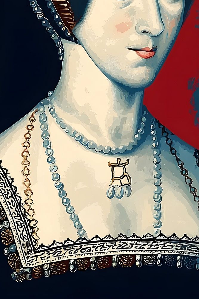 Das Porträt zeigt Anne Boleyn in einer stilisierten, pop-art-artigen Interpretation. Ihr Gesicht ist ruhig und würdevoll dargestellt, während das historische Tudor-Kleid, Perlenketten und der charakteristische Anhänger mit dem Buchstaben „B“ ihre Identität betonen. Der Hintergrund aus kräftigem Rot und dunklem Blau setzt einen modernen,…